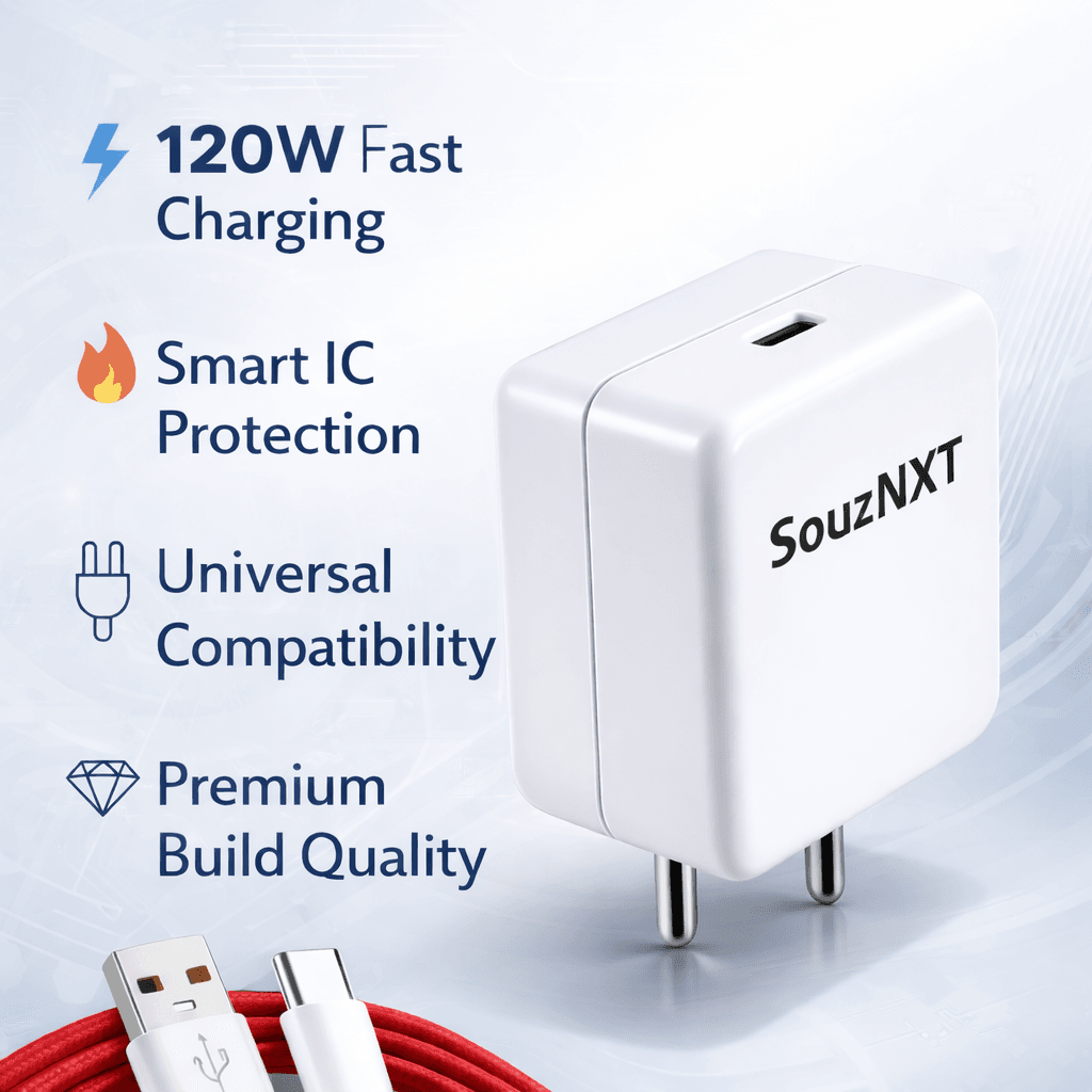 Upgrade your charging experience with the SouzNXT 120W Fast Charging Adapter with Type-C Cable, designed for high-speed performance, safety, and wide compatibility.