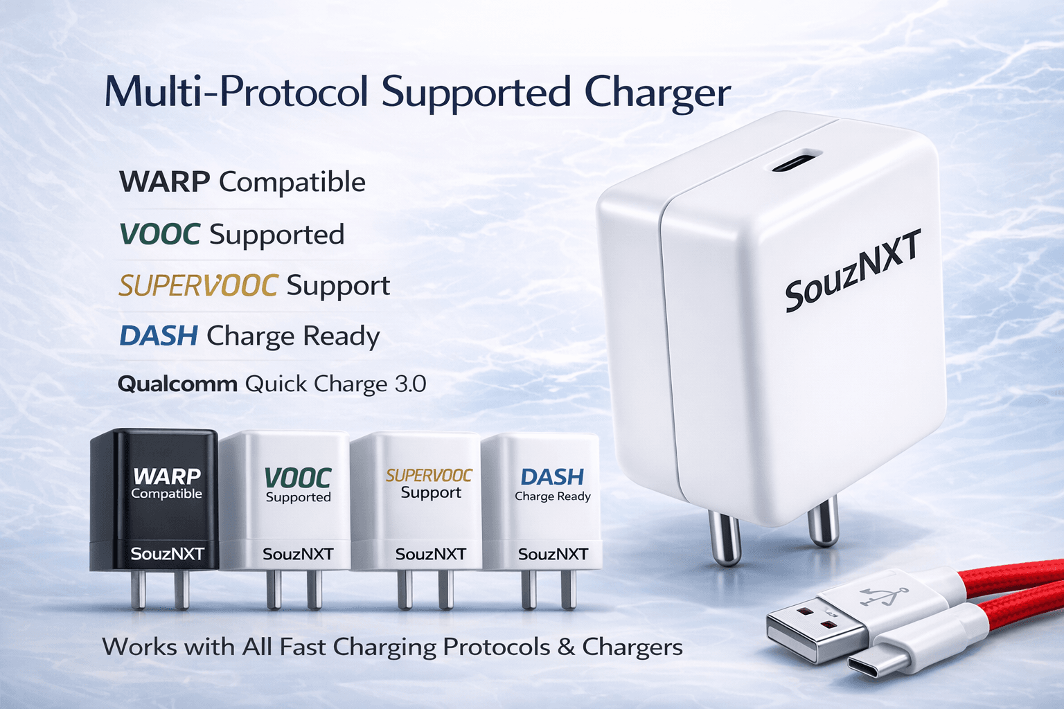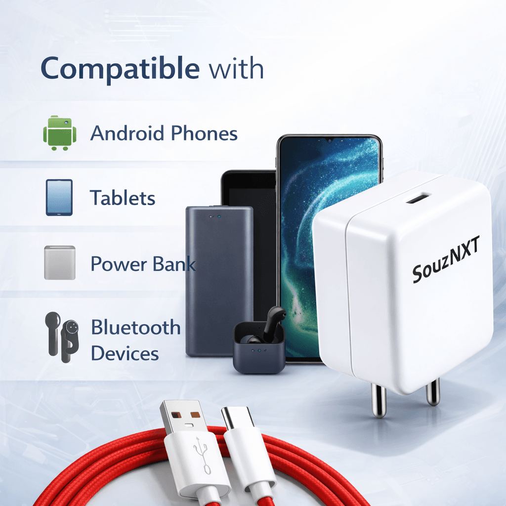 Included with the charger is a high-quality Type-C cable, designed for durability and efficient power transfer. The cable supports fast charging and stable data transmission, making it perfect for daily use.With its compact and premium design, the SouzNXT charger is easy to carry and ideal for both home and travel use. It is compatible with smartphones, tablets, power banks, and other USB-powered devices.