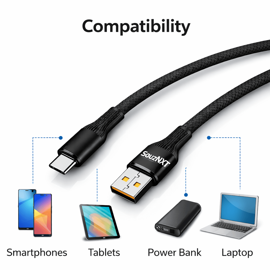 With a convenient 1.2-meter length, it offers the perfect balance between portability and usability. Compatible with a wide range of devices including smartphones, tablets, power banks, and more, the SouzNXT cable is your all-in-one solution for charging and data needs.