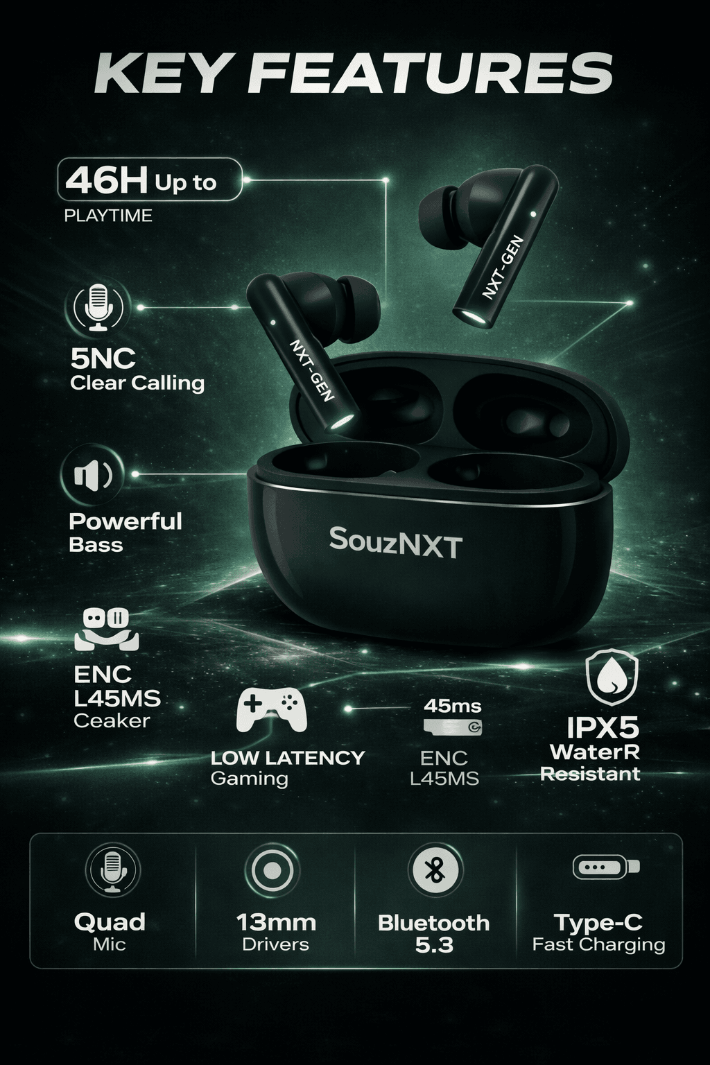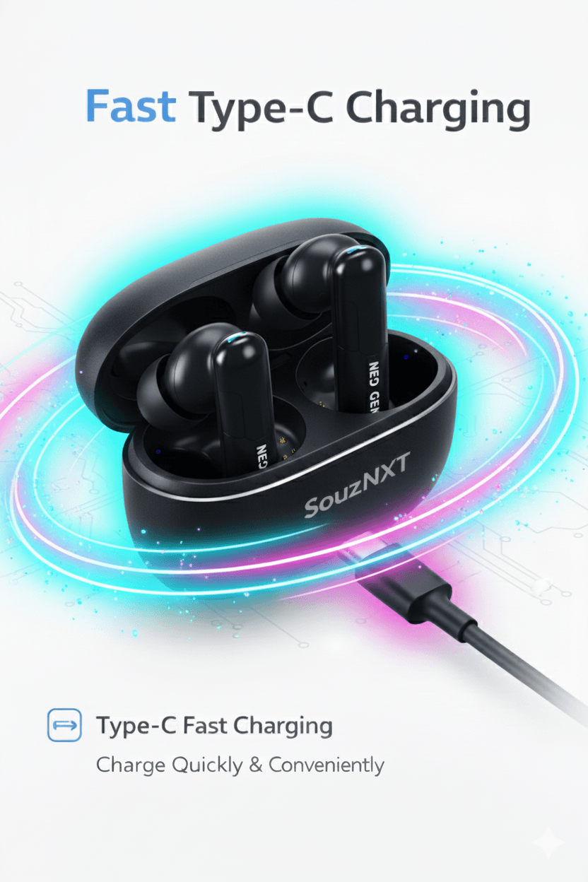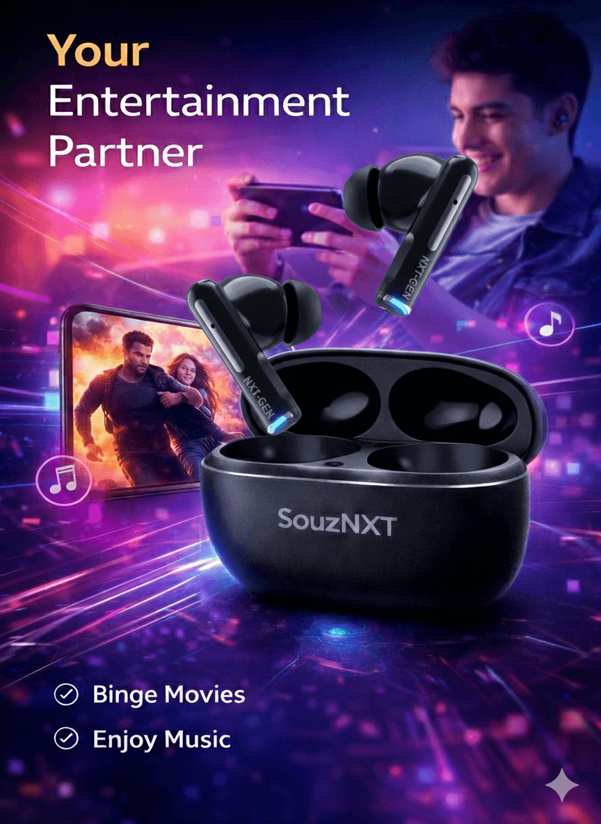 The ergonomic and lightweight design offers a comfortable fit for long listening sessions. With a stylish matte finish and durable build, SouzNXT Bolt earbuds combine performance, comfort, and modern style.