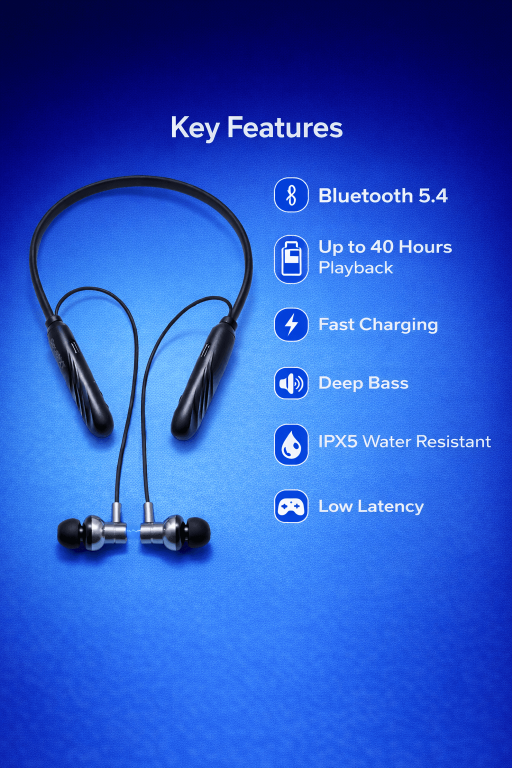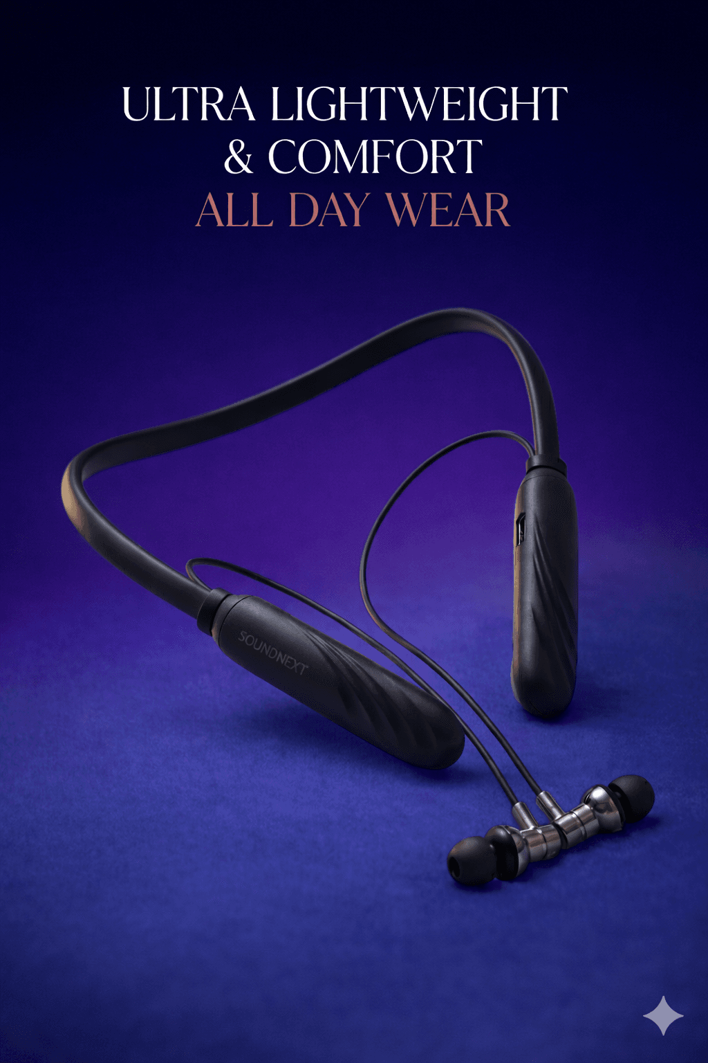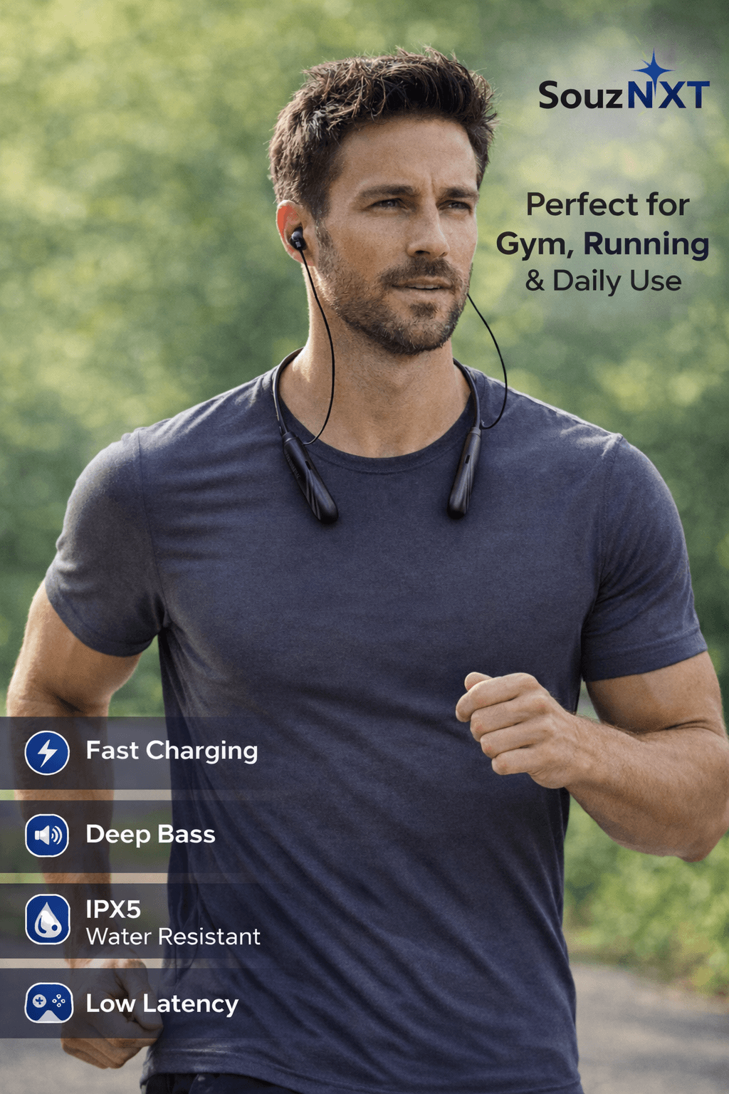 Experience powerful sound and all-day comfort with the SouzNXT SportBeat 40 Wireless Neckband. Designed for music lovers and active users, this stylish neckband delivers an immersive audio experience with deep bass, clear vocals, and stable Bluetooth connectivity. Whether you are working out, traveling, or taking calls, this neckband keeps you connected and entertained all day.