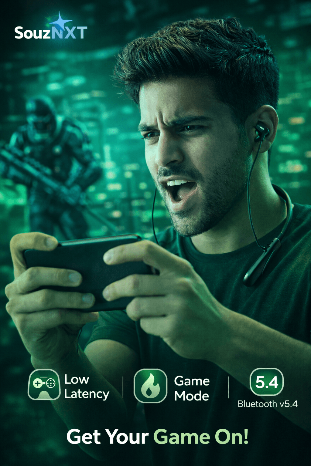 The low latency mode enhances your gaming and video experience by reducing audio delay, ensuring perfectly synced sound while watching videos or playing games. With its stylish design, strong battery life, and premium sound quality, the SouzNXT SportBeat 40 Neckband is an ideal choice for modern users who want performance, comfort, and durability in one device.